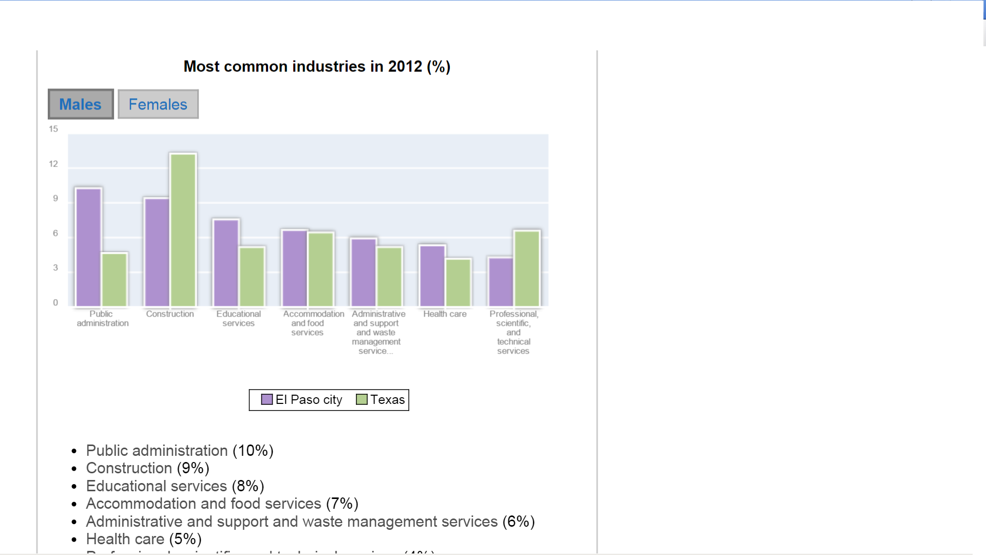 Take a look at the bars on the left.  The data for females also showed higher percentages of people involved in public administration here in El Paso than in the rest of the state.