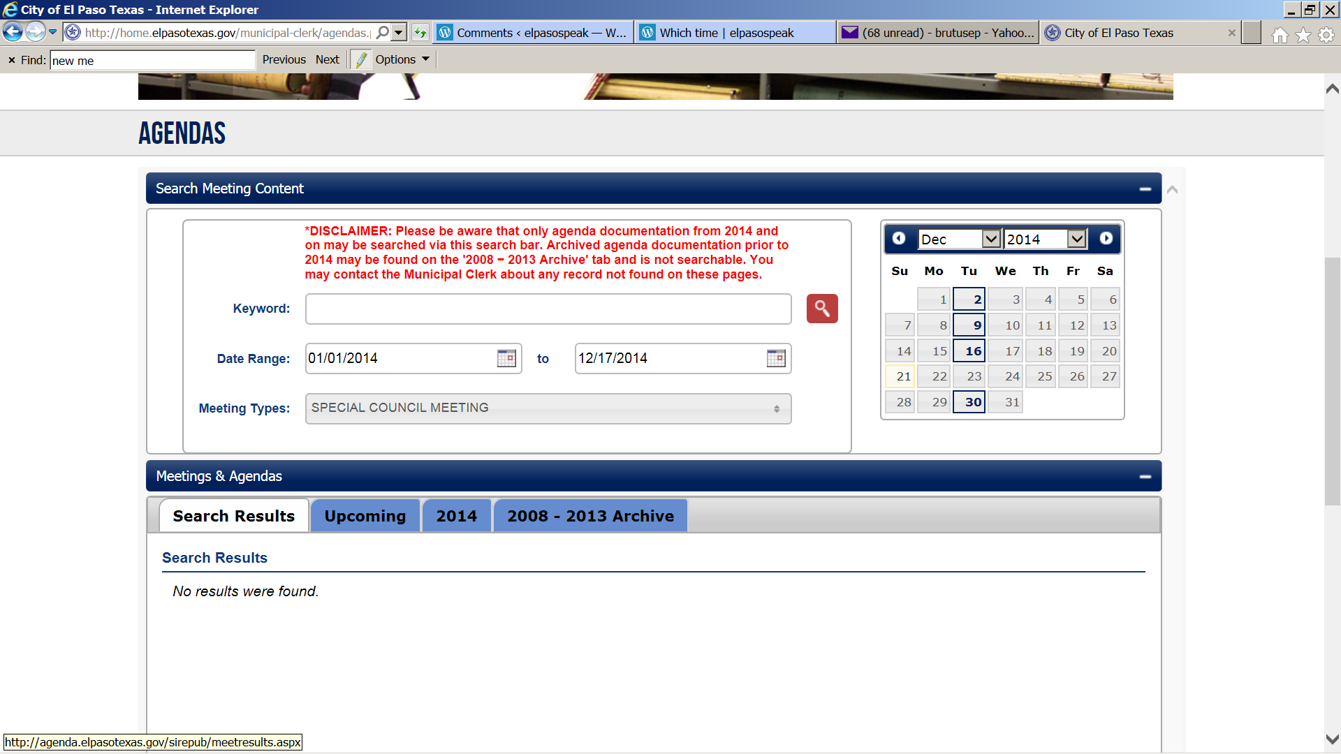 They held a special city council meeting on Monday, December 15, 2014. Where was the required public notification that the meeting was to be held? Back at the city web site this is what showed up when a search for any special meeting in 2014 was entered: