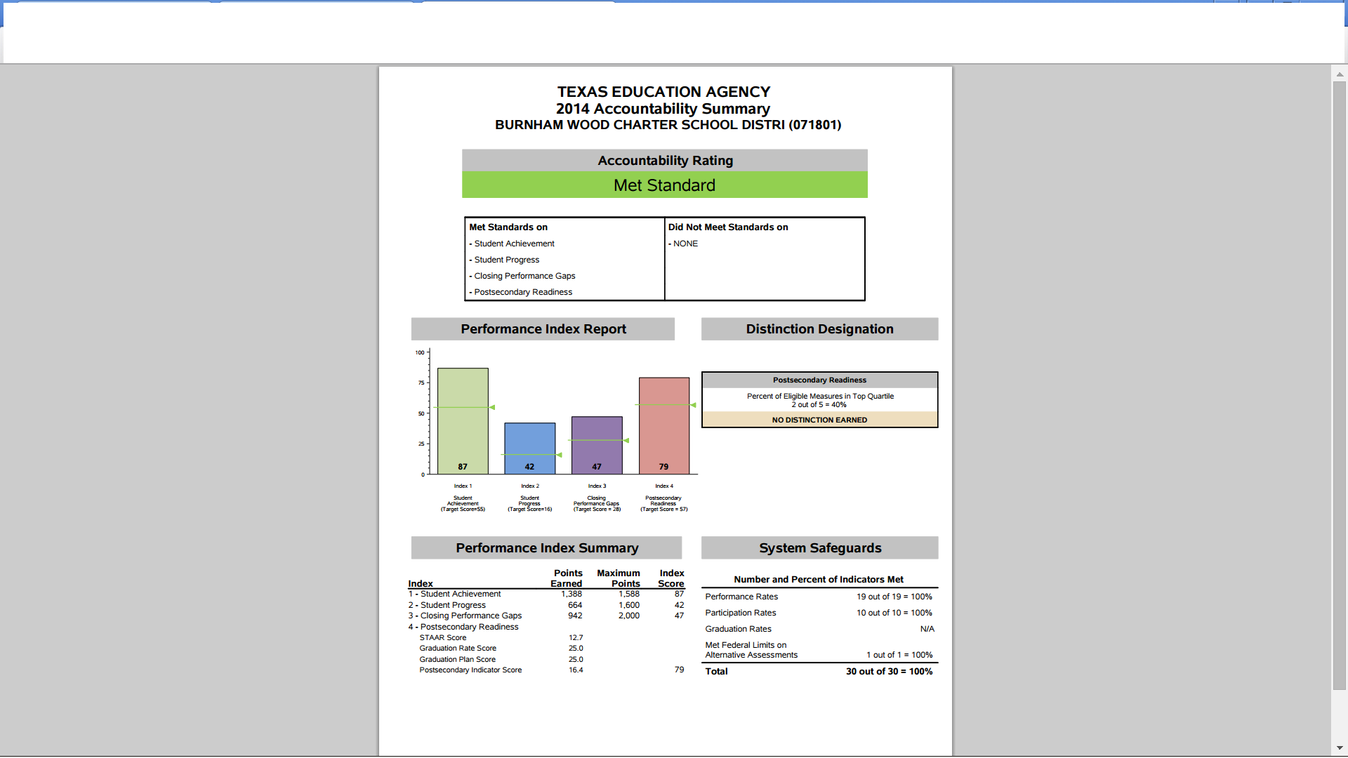 The Texas Education Agency (TEA) publishes an “Accountability Summary” for each school and school district. They rate each in four areas, 1) student achievement, 2) student progress, 3) closing performance gaps, and 4) postsecondary readiness.