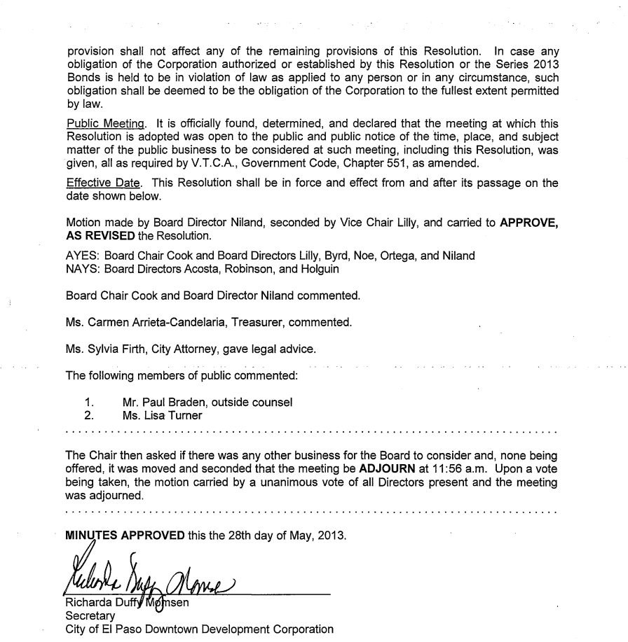 The fact is that the bonds were authorized for sale on May 28, 2013 and that any one of three people were “hereby authorized to act on behalf of the Corporation in selling and delivering the Series 2013 Bonds …”.  The issue was out of city council’s hands.