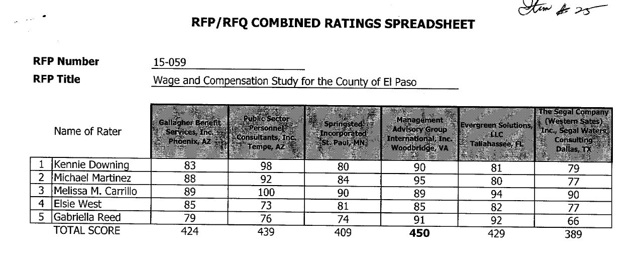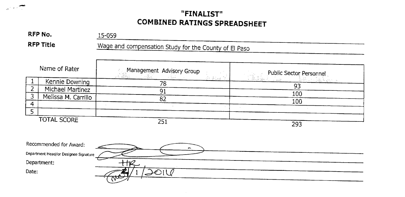 We took a look at the backup material presented to our commissioners when the contract award came up on the agenda.  This document shows the result of the evaluation:
