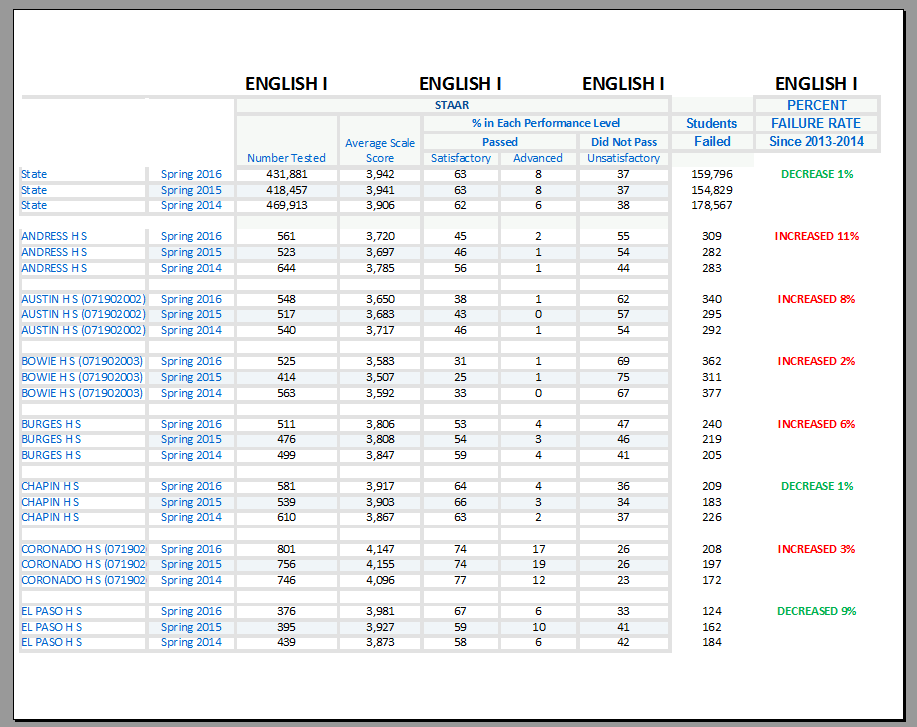 While statewide a slightly higher percentage of students are passing the STAAR English I test, many of our EPISD schools are showing declining percentages of passing students.