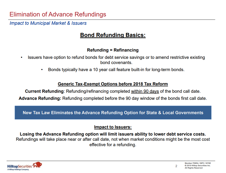 Evidently under the new law they will only be able to do this within a window 90 days before the published call date for the original bonds.  According to the chart above the call date on bonds is typically 10 years after the bonds were issued.