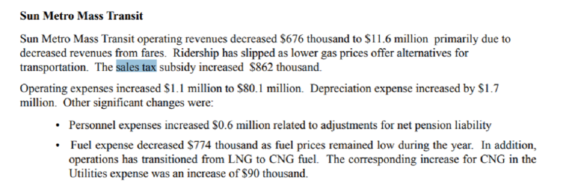 Despite the major investments that Sun Metro has been making, money collected from passengers decreased $676 thousand from the prior year.