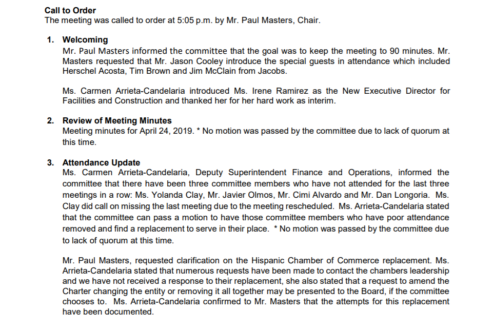 So WHO selected, appointed these people? Cabrera, his minions, the School Board? “Pick people we know will never show up. Then WE can just say, well the “Advisory” Board never showed up, so WE just do whatever WE want”. That’s what WE get in El Taxo. The PEOPLE not REPRESENTED by anybody. Tax, waste, spend, increase taxes. NO representation for the PEOPLE. Millions, BILLIONS$$$$ just flushed down the toilet and nobody knows where it all went, nobody accountable to TAXPAYERS. “Well Mr Cabrera WANTED a new Mercedes and then there is the all EXPENSES PAID “Conferences” to Las Vegas, Bahamas, Cancun………….First Class air travel, of course.