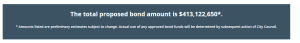 The footnote says: “Amounts listed are preliminary estimates subject to change. Actual use of any approved bond funds will be determined by subsequent action of City Council”.
