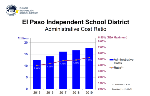 This is the phoniest figure in all of the EPISD data. What makes it phony is that monies spent on administration from certain funds are not counted in the formula. In other words, the Administrative Cost Ratio is dependent upon which funds are used to pay them. There are few if any policies that tell which Functions’ salaries have to be paid from.