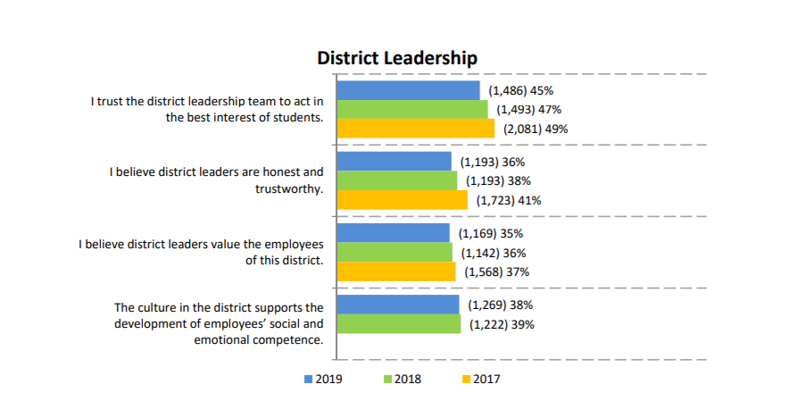 Only 36 percent of the respondents agreed with the statement “I believe that district leaders are honest and trustworthy”.